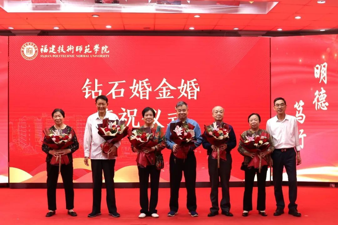 在活动仪式上,商光美副校长为3对金婚夫妇代表和70周岁、80周岁的13位寿星代表送上鲜花和祝福,与代表们亲切交谈并合影留念。钻石婚金婚代表陈文泉、寿星代表赖烺秋先后发言。