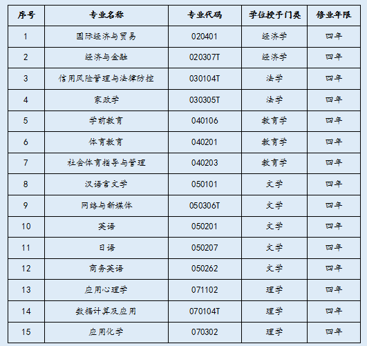 获批新增的5个本科专业为:财务管理、经济与金融、信用风险管理与法律防控、家政学、烹饪与营养教育。