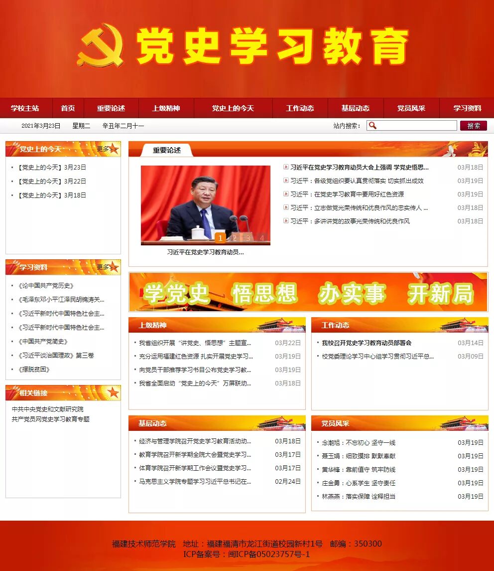 专题网站旨在深入贯彻落实党中央关于在全党开展党史学习教育的决策部署,贯彻落实中央、福建党史学习教育动员大会以及全省教育系统党史学习教育动员部署会精神,宣传展示学校党史学习教育工作动态和成果,确保党史学习教育取得扎实成效。